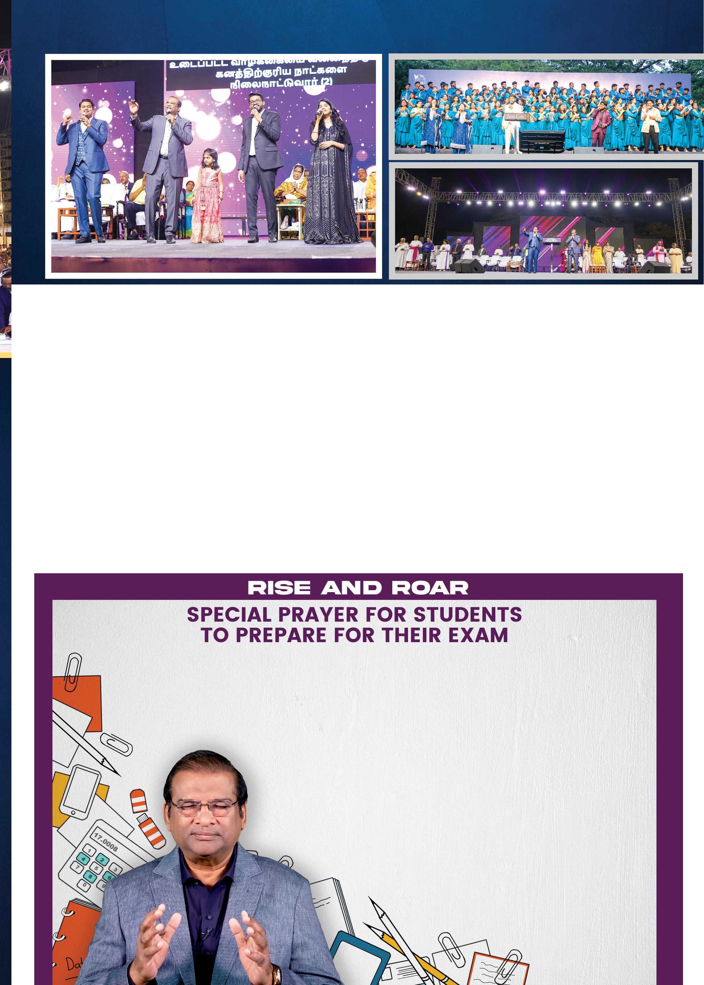 The evening session began with an invocation prayer by Pastor Justin Samuel, followed by an inspiring worship led by Pastor Benny Joshua. Students from Karunya Institute of Technology and Sciences presented a powerful skit on holy living and rebuilding lives on godly values. Worship leaders Stella Ramola and Daniel Davidson then led the gathering into an anointed time of praise.