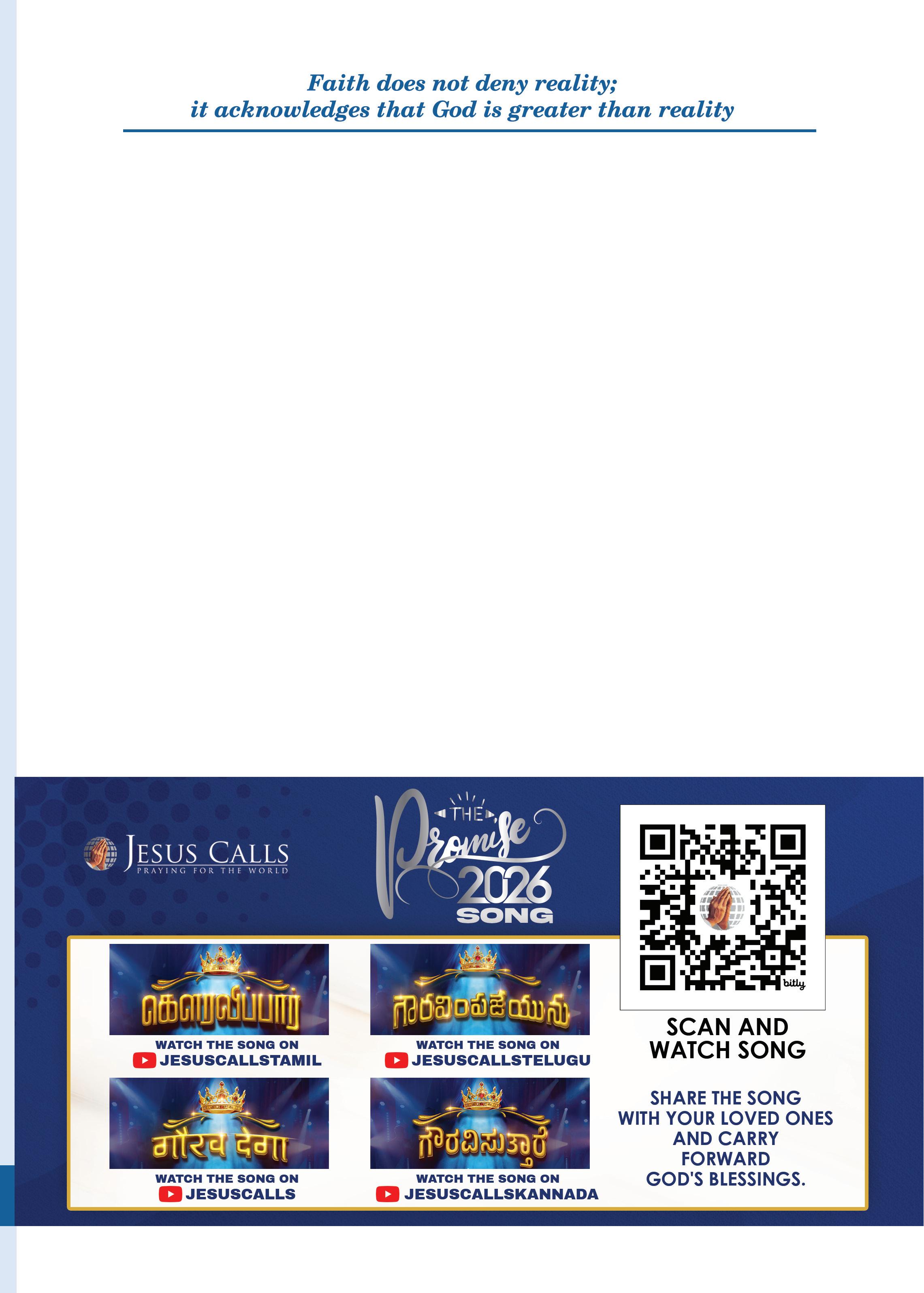 The Lord declares, “I will stand with them, do justice, and fulfill My will.” His justice never fails. When God stands with you, no one can stand against you. Nothing can overcome you. “No weapon formed against you shall prosper,” (Isaiah 54:17) and the Lord will cause your righteousness to shine before others like the light of day, bringing honour to His name through your life. Therefore, do not be afraid. Rise up and do the will of God. Fulfil His righteousness with courage and obedience. The Lord once spoke to our family and said, “The more people ridicule you with lies or curse you out of jealousy, the more I will bless you.” That is why we choose not to respond to accusations or ignorance. We simply continue doing the will of God. Through this obedience, God has touched millions of lives through Jesus Calls, Karunya, and SEESHA.