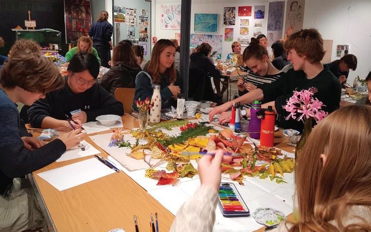 On 28 November 2025, the Art Club hosted an end-of-term exhibition preview for College members. The theme for this exhibition was ‘Wish You Were Here’. The exhibition was also open to the public on Saturday 29 November and Sunday 30 November. The varied programme this term has included lino printing, life drawing, pumpkin carving, sketching sessions in the Chapel and watercolour botanicals in collaboration with the Green Society (pictured below).