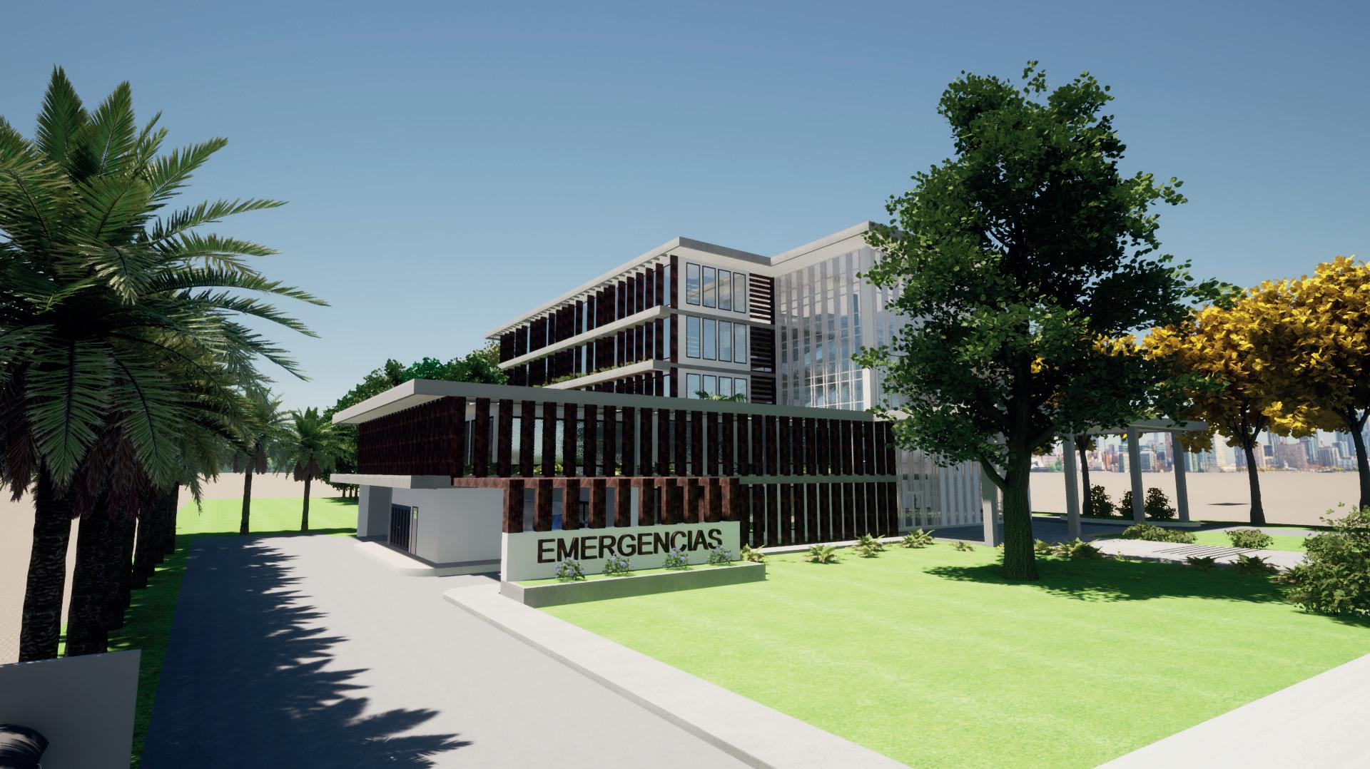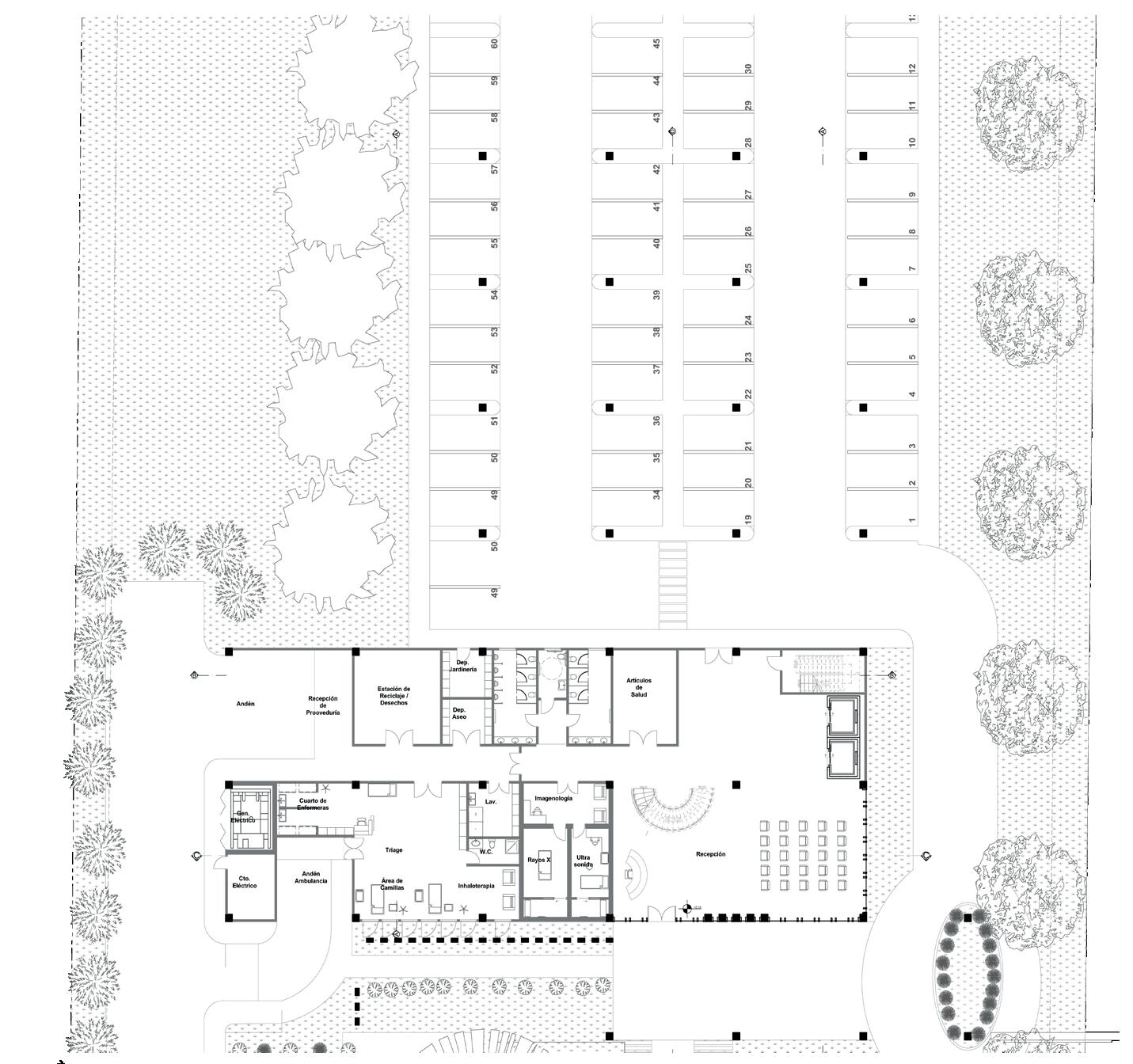En la planta baja se desarrollaron los espacios de ingreso, estacionamiento y el área prioritaria de emergencias en el frente. En este nivel se encuentra la gran área de espera y la recepción. Espacios ubicados en el gran vestíbulo de altura cuádruple.