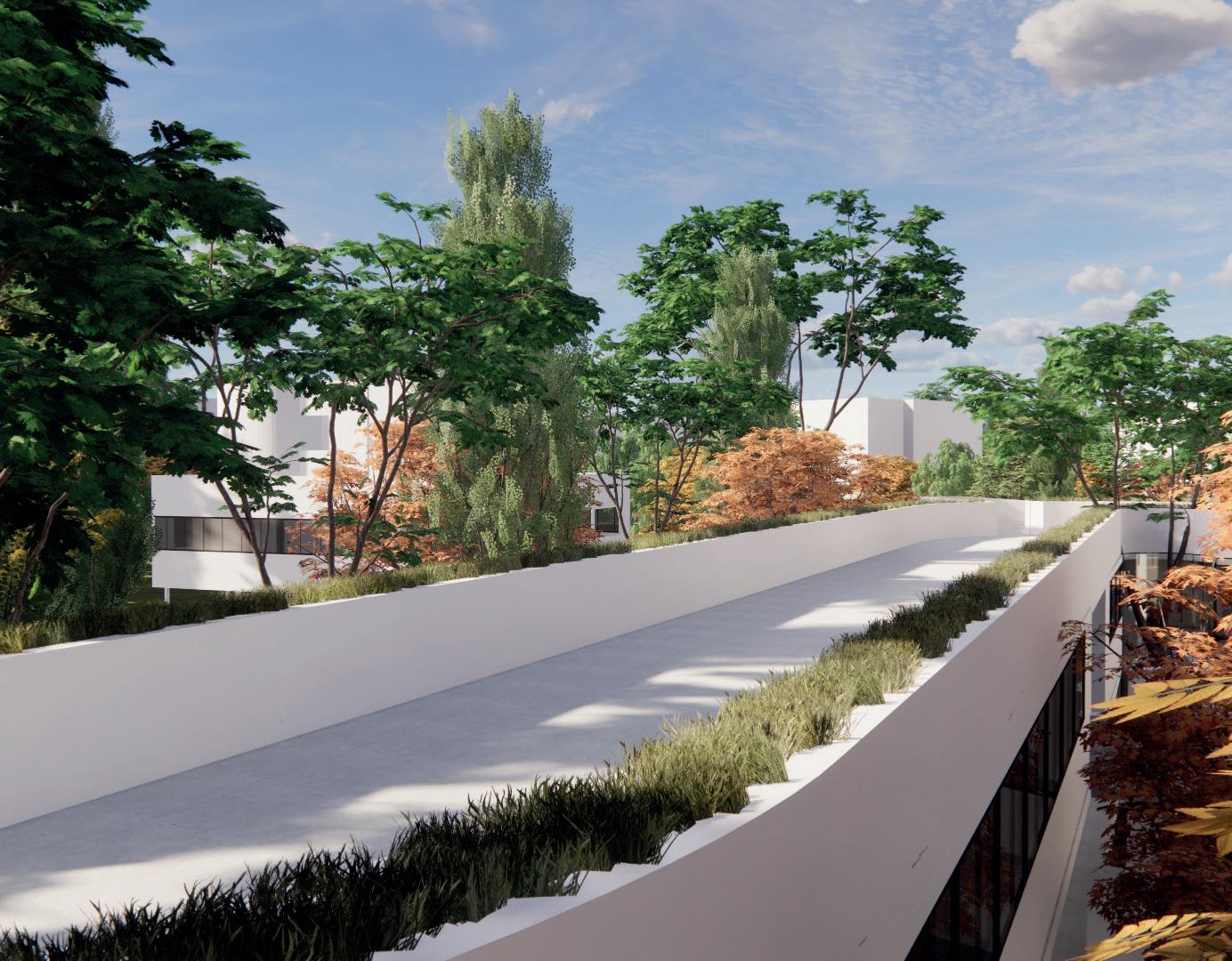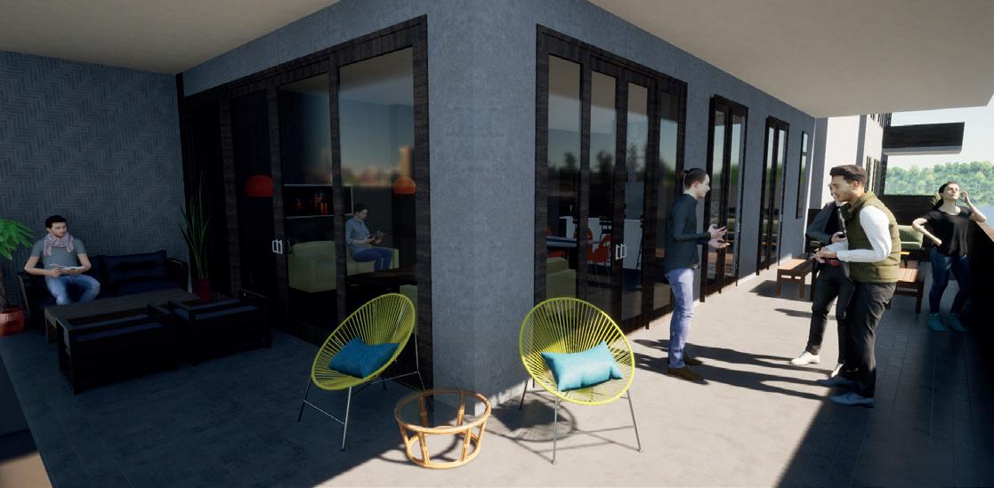 Esta primera área social se desarrolla en el nivel 3 de la torre. Aquí están ubicados el parque infantil, una terraza abierta, el espacio de coworking, el huerto comunal y el lounge.