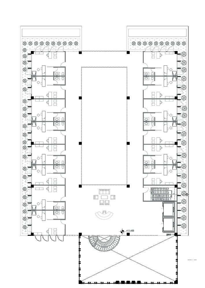 En los últimos tres niveles del edificio la planta y la disposición de los espacios se mantienen. Estos tres niveles conforman los consultorios de consulta externa, los cuales están completamente equipados y cuentan con su baño privado. A medida que se sube de nivel, el largo de los balcones ajardinados se reduce.