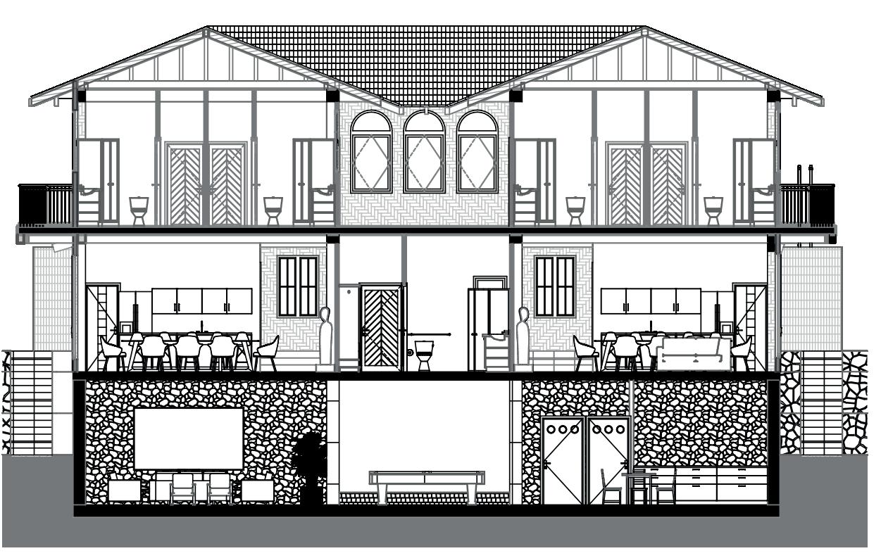 En la planta alta se desarrolla el área de descanso de los miembros de cada familia. Ambas viviendas cuentan con una gran sala familiar que cuenta con acceso al balcón posterior y a la terraza compartida.