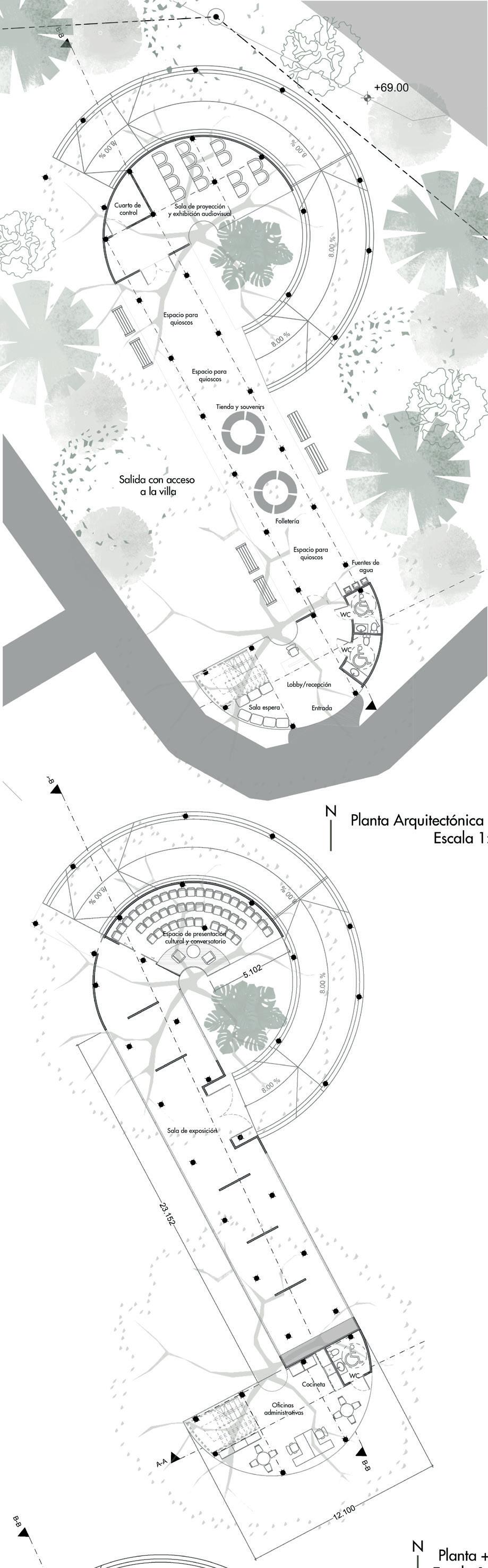 En el primer nivel se encuentran las oficinas administrativas, el auditorio de presentaciones culturales, la galería de exhibición arquitectónica y de nuevas intervenciones.