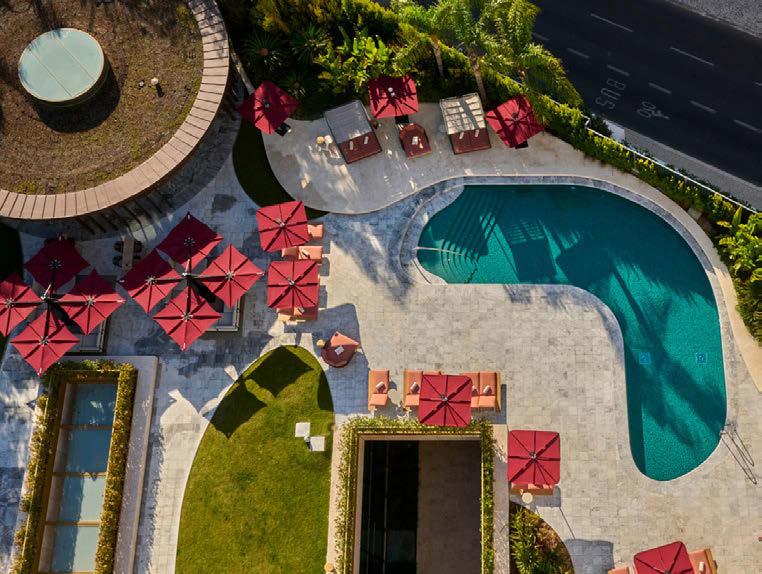 Although Lisbon sees over 300 sunny days a year, a hotel with an outdoor swimming area is a rarity in the popular destination city. The Four Seasons Hotel Ritz Lisbon, with its entirely redesigned outdoor pool, has filled that niche in stunning mid-century style. The hotel’s lushly landscaped pool area provides the perfect year-round getaway, with its comfortably-heated water temperatures and underwater speakers. The pool bar, covered in hand-crafted tiles, provides Lisboninspired cocktails and refreshing bites for those who simply want to enjoy some poolside relaxation, and the organic contour of the pool and the hotel’s luxury lounge chairs create a serene, park-like escape where guests can relax and enjoy the city views.