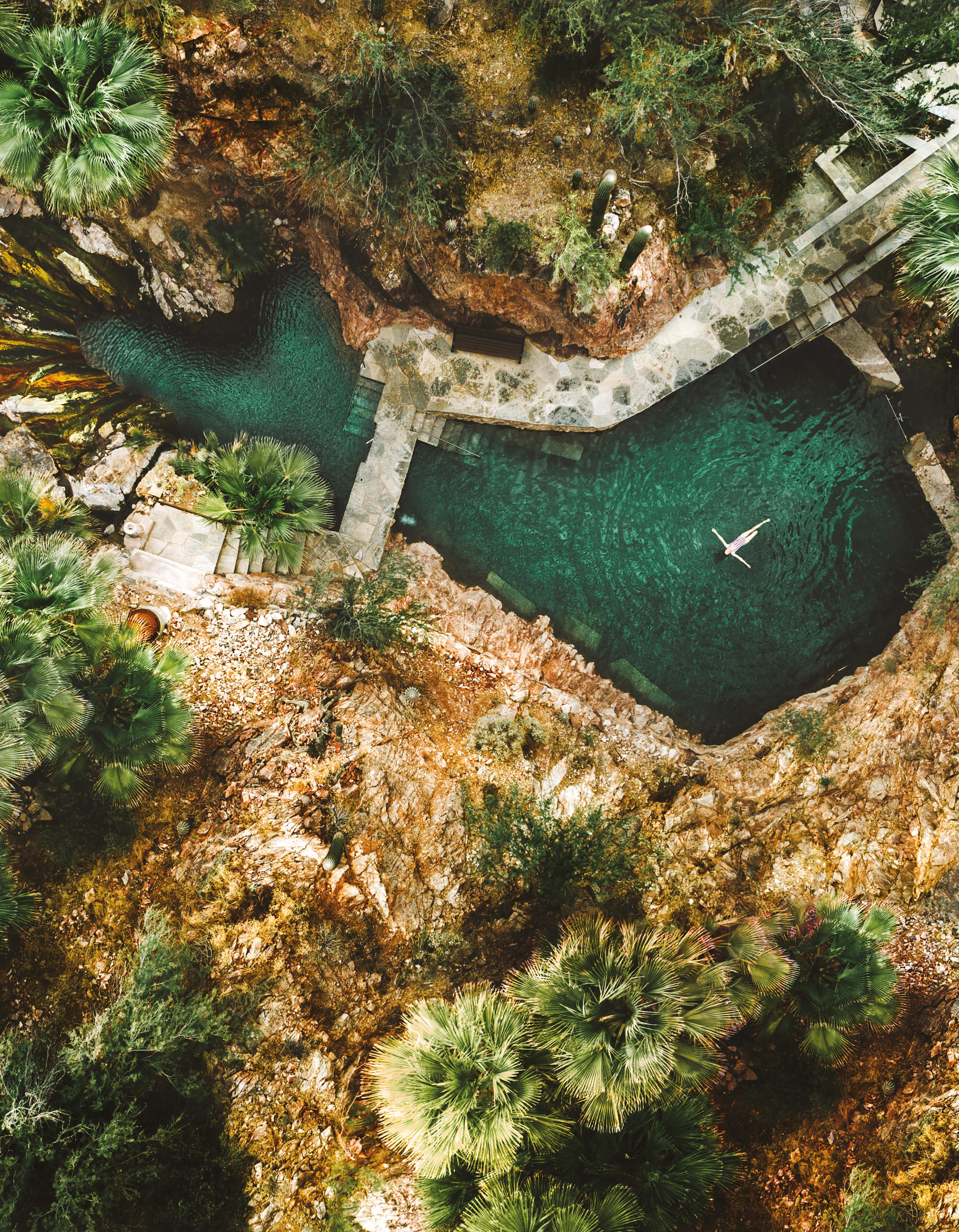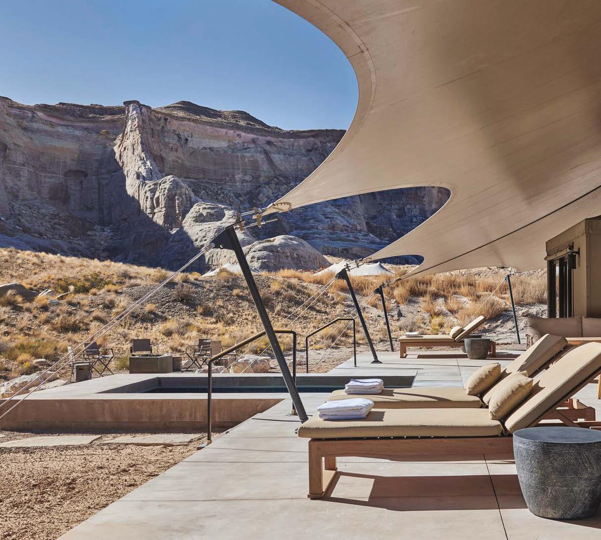 Inspired by the golden age of space exploration, the idyllic design of Echo’s “Sky Pods” is striking, to say the least. The pods rise up on the horizon like superstructures from a parallel multiverse. Futuristic and nostalgic all at once, six heated pods were created using compos ite fiberglass with floor-to-ceiling windows through which you can lose yourself in the lunar-like landscape from the comfort of your bed. Wak ing up at Echo, encircled by otherworldly geological formations, feels like you’ve lifted off the planet without actually leaving Earth.