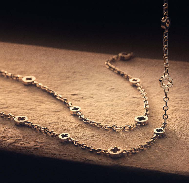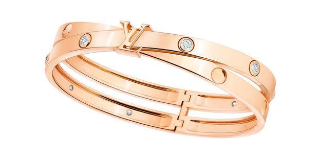 The Empreinte sautoir is the hero statement of the collection. It features the open-worked monogram set along gold chains. Versatile as it is kinetic, it can be worn as a long necklace, wrapped to make a shorter necklace, or even as a bracelet. The dramatic, showstopper ear cuffs are the most playful pieces in the collection. They come in pink gold with the LV monogram and diamonds. The darling famous flower makes a delightful appearance in hoop earrings. From the front, they look like classic hoops, but the side view reveals the open-worked flower wrapping around the earlobe. An endearing bracelet design elevates the trunk stud idea by featuring two interconnecting bangles: one with the inverted studs, the other with diamonds.