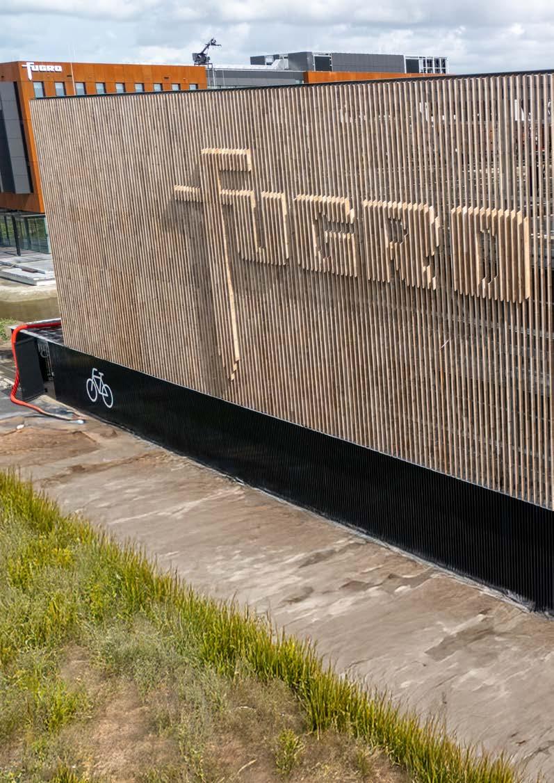 Voor de parkeergarage leverde Foreco maatwerk houten geveldelen. Deze delen werden vooraf aangebracht op geprefabriceerde panelen, waardoor de montage op de bouwplaats snel en efficiënt kon verlopen. Die snelle plaatsing was van groot belang, omdat een groot oppervlak bekleed moest worden met hout. Een bijzonder aspect van het ontwerp is de toepassing van twee houten balklagen die voor elkaar hangen. Door dit slimme reliëf ontstaat er een subtiele driedimensionale weergave van het Fugrologo op de gevel. Een uniek visueel element dat het gebouw direct herkenbaar maakt. Daarnaast zijn de balken aan beide uiteinden schuin afgezaagd onder een hoek van 30 graden, zodat het water eraf kan lopen.