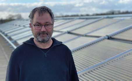 Chris Weerman van Metaalindustrie Waelbers k iest voor het milieu. Daarmee haalt hij ook zijn operationele kosten ink naar beneden. De warmte van de bakken in de ver zinkerij van zijn bedrijf - en de vloer verwarming van alle hallenhaalt hij voor een groot deel uit zonnewarmte. Samen met In nity Solar heeft hij 32 collectoren op het dak gelegd, goed voor 14.000 liter warm water. Zijn gasgebruik is gedaald naar de helft van dat van een gemiddelde eengezinswoning