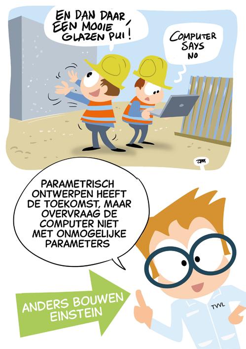 • Sneller rekenen met mind er kans op fouten: door het gebruik van parametrische software word en versch illend e ontwerpo pties real-time doorgerekend. Pres taties van deze o pties, zoals daglichttoetreding, materiaalgebruik en isolatiewaarde kunnen eenvoudig vergeleken word en. Het ontwerpproces wordt h iermee transparant en inzichteli jk voor alle betrokken parti jen. Met behulp van de weegfactoren kunnen ond erbouwd e ontwerp- en materiaalkeuzes gemaakt word en. Omdat er in het ontwerpproces met dezelfd e uitgangspunten automatisch wordt gerekend, komt er geen handmatig rekenwerk bi j kijken. Dit vermind ert de kansen op fouten en daarmee faalkos ten. Ook gebouwen met organische of complexe vormen, zi jn eenvoudig door te rekenen met betrouwbare resultaten.