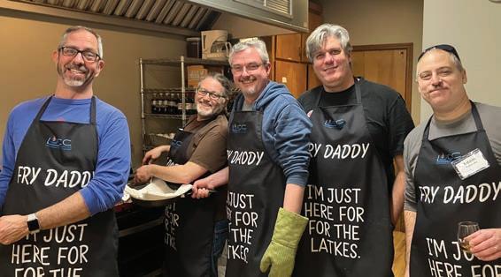 Above right: The “Fry Daddies” prepared latkes for the LJCC’s Hanukkah party last year. Pictured (from left) are Howard Lubliner, Greg Rudnick, Russell Swinburne-Romine, Michael Hennecke and Adam Dubinsky.