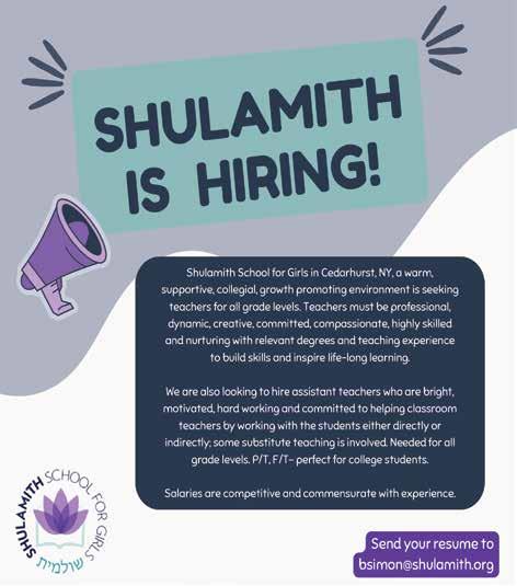 A YESHIVA IN QUEENS is looking for an experienced part/ full time secretary, 2-year-old morah, kindergarten morah, kindergarten morah assistant and Pre-1A English teacher for the 2022-2023 school year. Nice and timely pay. Please email resume to mshelt613@gmail. com or call/text 718-971-9799.