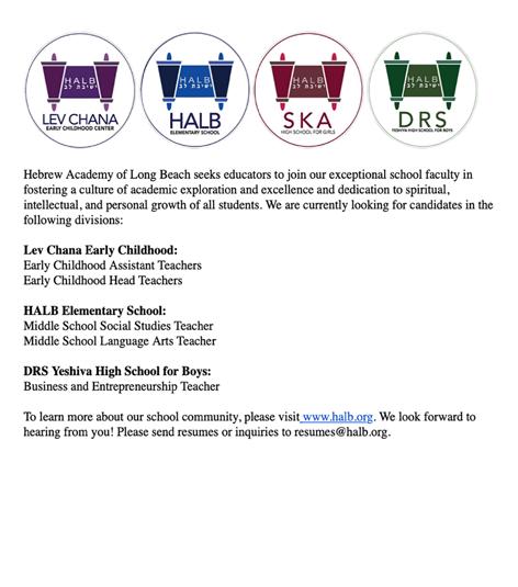 is looking for an experienced part/ full time secretary, 2-year-old morah, kindergarten morah, kindergarten morah assistant and Pre-1A English teacher for the 2022-2023 school year. Nice and timely pay. Please email resume to mshelt613@gmail.com or call/text 718-971-9799.