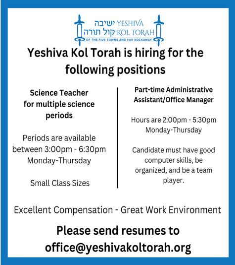 Classified Deadline: Monday 5:00PM classifieds@fivetownsjewishhome.com text 443-929-4003