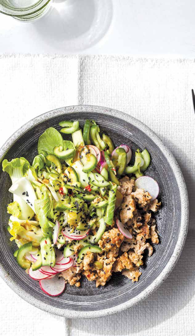 This is what I want for dinner most nights. After a long day of cooking breakfast, lunch, and dinner, testing recipes, and just general mom-ing, I’m tired and hungry. I don’t want something heavy because my body is too exhausted to handle anything like that. I want something light and crunchy, but it must have a chewy, hot and cold element to it. That’s what this is. The ground chicken crumble, which sounds crazy but I guarantee is quite genius, is so delicious and satisfying and together with the cold properly cut cucumber (although if you don’t properly cut your cukes, I won’t tell anyone), and the umami packed, punchy vinaigrette hits just the spot!