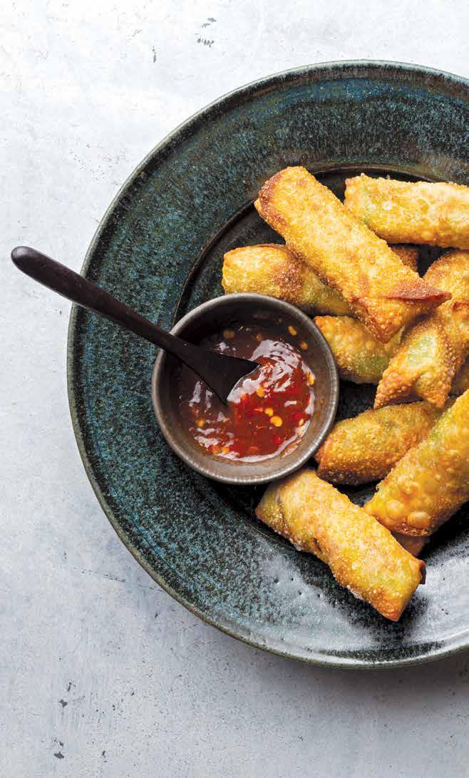 Place 1 heaping tablespoon of avocado mixture near the corner of an egg roll wrapper triangle, then brush the edges with a little water. Roll over once, then fold the sides of the triangle over and continue to roll till closed. Do the same thing (if using) the square wonton wrappers. Repeat with remaining avocado mixture and wrappers.