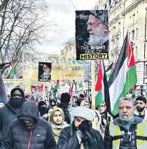 Some marchers displayed banners with Khamenei’s photograph and declared themselves to be on the “right side of history” as they made their way through London.