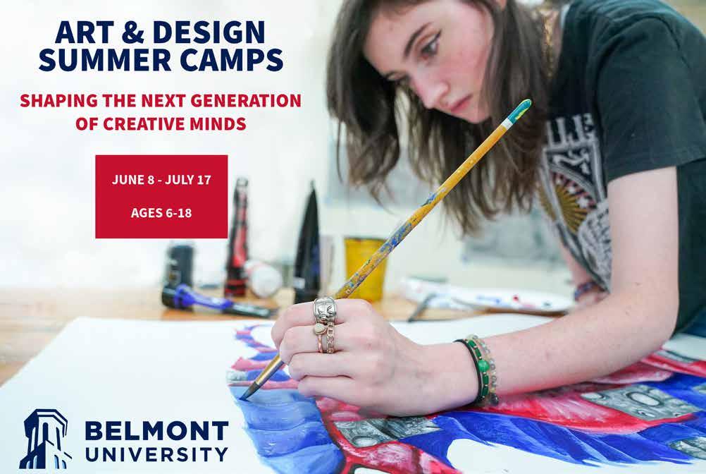 Awith emphasis on problem solving, designing, communicating and creating. Young artists will have the opportunity to work with high-quality materials, in college-level studios. The R.O.Y.G.B.I.V. Multi-arts Camps for ages 9-11 are inspired by weekly themes: Monsters and Magic, Mysteries of Space, Wacky Weather, and Wild Kingdom. Campers spend half of the day exploring 2D art mediums and the other half exploring 3D art, and every kid leaves with a portfolio that expresses their creative investigation of the week’s theme. The Studio Series Camp for ages 12-14 delves into a specific media or artistic discipline each week. This summer camp offers classes in Illustration, Mixed Media and Printmaking, Photography, and Drawing and Painting. They also have a precollege experience, Summer Studios, for ages 15-18, led by college faculty and industry professionals. Teens are invited to explore creative majors of architecture, fashion design and merchandising, fine art, graphic design, interior design, and photography. After each camp session, all youth will display their work alongside their peers in an art show open to all our artists’ families and friends. Learn more at: https://www.belmont.edu/watkins/ community-education/youth-programs.html •