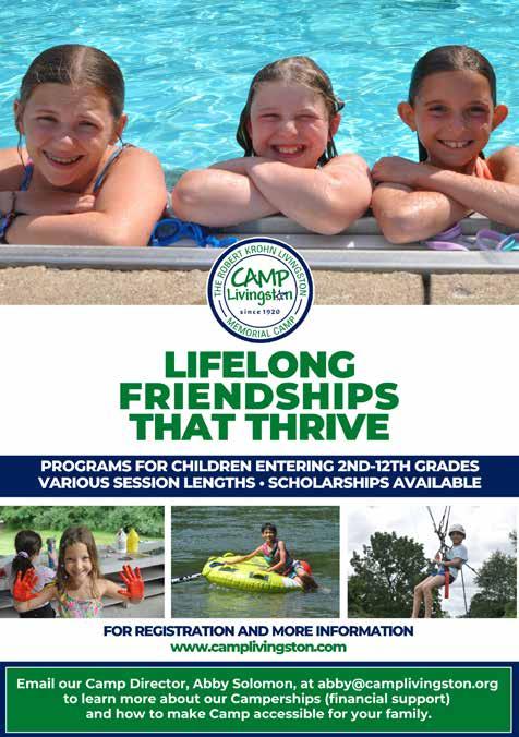 Camp Livingston sits on 680 acres of beautifully wooded land in Bennington, Indiana and features a waterfront with water skiing and tubing; a low and high ropes course and climbing wall; a swimming pool; endless hiking trails; a baseball diamond, tennis courts, a volleyball court, basketball courts, archery and athletic fields; a state-ofthe art theater; and an arts and crafts center. Sports, art, drama, dance, travel, hiking, camping – through these experiences, campers build their self-confidence, make new friends, and thrive. Each and everyday at Camp Livingston, campers form lifelong friendships and develop new skills as they cultivate a strong and enduring sense of Jewish identity.