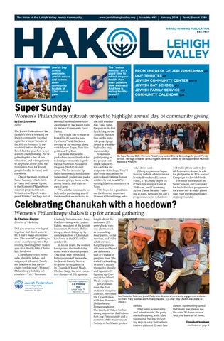 Women’s Philanthropy mitzvah project to highlight annual day of community giving By Carl Zebrowski Editor The Jewish Federation of the Lehigh Valley is bringing the Jewish community together again for a Super Sunday at the JCC on February 1, the weekend before the Super Bowl. But the goal here is not a sports championship. We’re gathering for a day of fun, education, and raising money to help fund all the good the Federation does for Jewish people locally, in Israel, and elsewhere. One of the main events of Super Sunday, which starts at 9 a.m. and runs to 1 p.m., is the Women’s Philanthropy mitzvah project at 11 a.m. Volunteers will pack waterproof Winter Care Bags full of