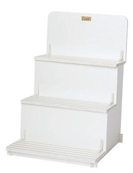 Three shelf step design ships flat and snaps together. Wood with a white wash finish and Scout logo. Hollow back for storing back stock.