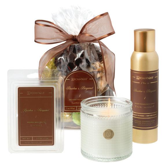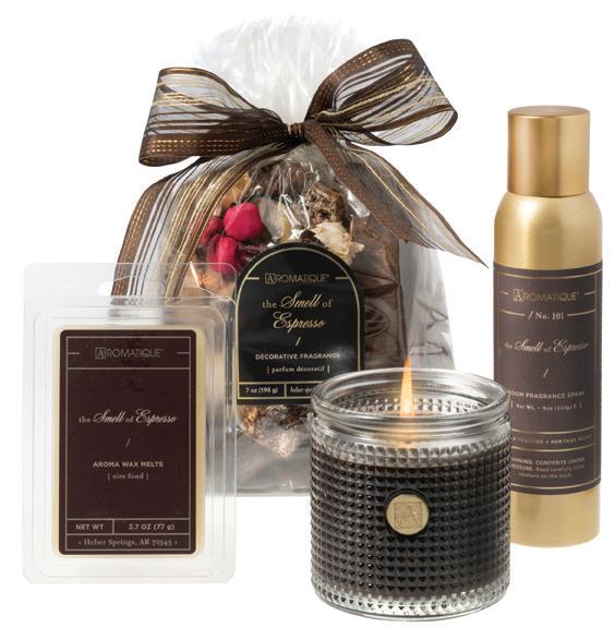 AEROSOL ROOM SPRAY - 5 OZ SKU: 40-228 CASE PACK: 8 UNIT: $7.00 MSRP: $14.00 SIZE: 7.125˝H X 1.75˝D TEXTURED GLASS CANDLE - 6 OZ SKU: 40-229 CASE PACK: 11 UNIT: $9.00 MSRP: $18.00 SIZE: 3˝D X 3.25˝H USE TIME: UP TO 40 HRS BURNING AROMA WAX MELTS - 2.7 OZ SKU: 60-506 CASE PACK: 12 UNIT: $3.75 MSRP: $7.50 SIZE: 3.375˝W X 5.125˝H X 1˝D USE TIME: UP TO 12 HRS/CUBE COMBO PACK SKU: 40-230 UNIT: $194.00 MSRP: N/A CASE PACK: 6 DECORATIVE FRAGRANCE 8 AEROSOL ROOM SPRAYS 6 TEXTURED GLASS CANDLES 6 AROMA WAX MELTS DECORATIVE FRAGRANCE STANDARD BAG - 7 OZ SKU: 40-227 CASE PACK: 15 UNIT: $10.25 MSRP: $20.50 USE TIME: UP TO 4 WEEKS REFRESHER OIL - .5 FL OZ SKU: 40-220 CASE PACK: 8 UNIT: $6.00 MSRP: $12.50 SIZE: 2.6˝H X 1˝D No 101 Warm The Smell of Espresso Freshly brewed espresso mixed with the sweeter elements of chocolate, buttery walnut, vanilla, and caramel. NEW LOOK 38 ~ 39 AEROSOL ROOM SPRAY - 5 OZ SKU: 57-658 CASE PACK: 8 UNIT: $6.50 MSRP: $13.50 SIZE: 7.125˝H X 1.75˝D TEXTURED GLASS CANDLE - 6 OZ SKU: 57-673 CASE PACK: 11 UNIT: $8.00 MSRP: $17.50 SIZE: 3˝D X 3.25˝H USE TIME: UP TO 40 HRS BURNING AROMA WAX MELTS - 2.7 OZ SKU: 60-524 CASE PACK: 12 UNIT: $3.75 MSRP: $7.50 SIZE: 3.375˝W X 5.125˝H X 1˝D USE TIME: UP TO 12 HRS/CUBE COMBO PACK SKU: 57-679 UNIT: $181.00 MSRP: N/A CASE PACK: 6 DECORATIVE FRAGRANCE 8 AEROSOL ROOM SPRAYS 6 TEXTURED GLASS CANDLES 6 AROMA WAX MELTS DECORATIVE FRAGRANCE STANDARD BAG - 5 OZ SKU: 57-678 CASE PACK: 15 UNIT: $9.75 MSRP: $19.50 USE TIME: UP TO 4 WEEKS REFRESHER OIL - .5 FL OZ SKU: 57-676 CASE PACK: 8 UNIT: $5.75 MSRP: $12.50 SIZE: 2.6˝H X 1˝D No 95