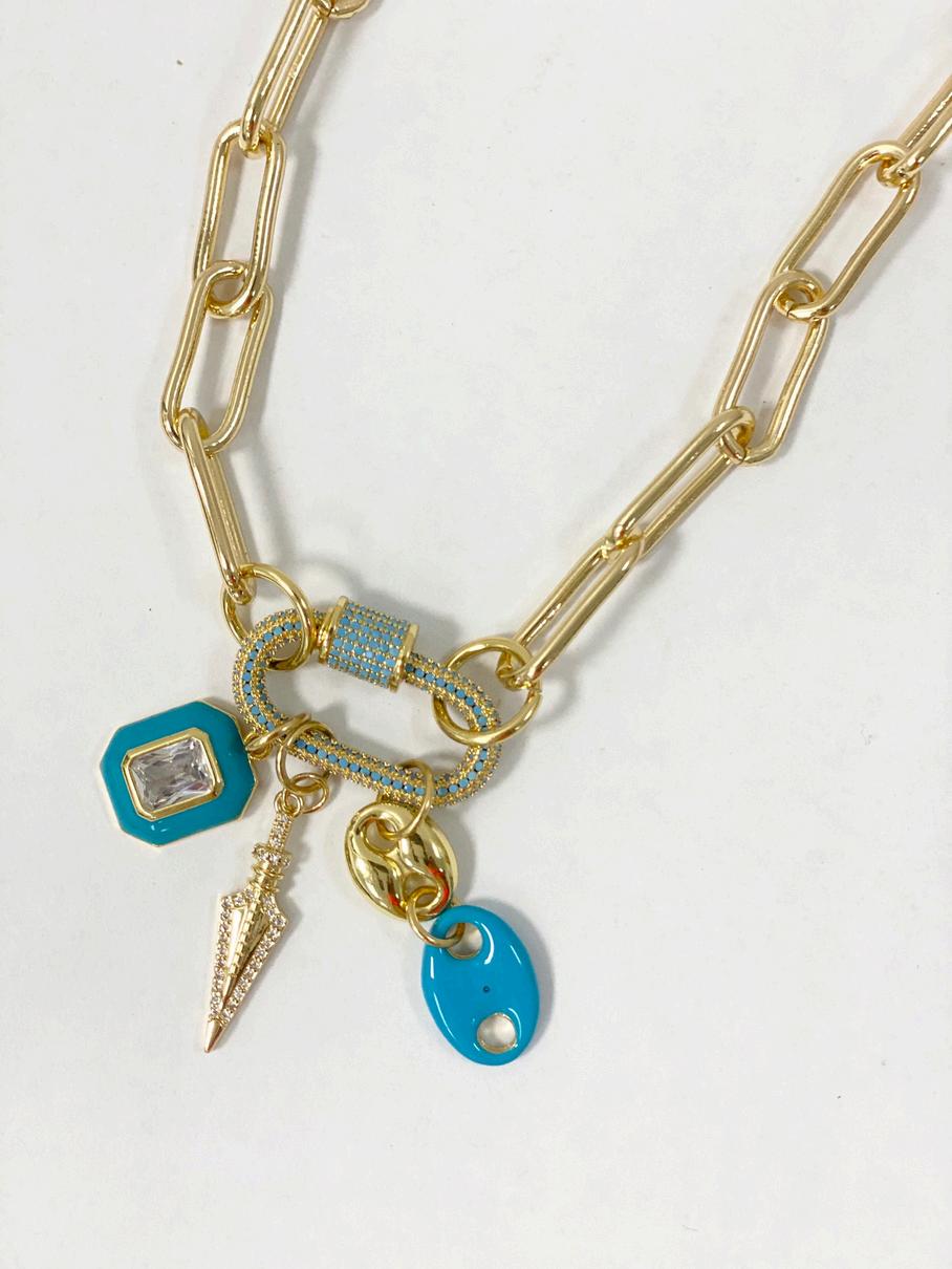 18K GOLD PLATED, WATER RESISTANT, TARNISH-FREE CARABINER FRONT CLASP WITH 4 CHARMS $65
