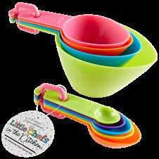 This measuring set includes 4 measuring cups (1 cup, 1 3 cup, ½ cup, ¼ cup) and 5 measuring spoons (1 tablespoon, ½ tablespoon, 1 teaspoon, ½ teaspoon, and ¼ teaspoon). All the cups and spoons can be separated for easy use, have a stackable space saving design, or can be held together for easy storage by one thick plastic ring. Colors of cups and spoons will be assorted at random. Random Color: Purple, Blue, Orange, Green, Yellow, Red. 4-pc cup set size: 6.5” (STACKED) 5-pc spoon set: 4.5” (STACKED) MULTIPLE 3 $4.50