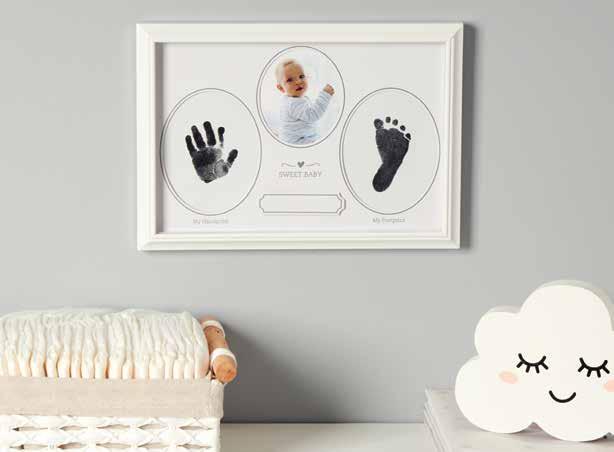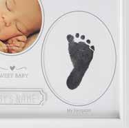 Capture baby’s 1st hand and footprint milestone along with his/her photo in our keepsake frst print frame. Includes matte with baby name plate and washable ink pad. Frame is made of white polystyrene. Glass. Easel Back Stand