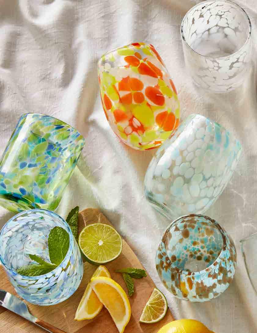 F NEW! G17162 GRATEFUL STEMLESS WINE GLASS (Multi) Glass. Dishwasher safe, top rack only. 4.73”H x 3.89”D. 18 oz.Pk 6 pcs. $5.50 ea.