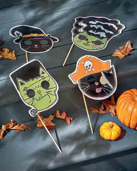 F NEW! G16784 HOCUS POCUS HALLOWEEN MASKS S/4 (Multi) Paper, wood. Handmade. Dust and wipe clean with dry cloth. Peggable packaging. Candy corn: 6.23”L x 3.7”H; Spider web: 7.72”L x 5.38”H; Orange pumpkin: 9.13”L x 4.65”H; Pink pumpkin: 9.98”L x 5.24”H; Packaging:. Pk 12 pcs. $3.00/set.