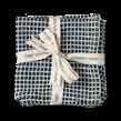 Cotton, polyfil. Hand screen dischargee printed, diamond quilted mitt w/ terry lining, hang loops, washed. Machine wash cold separately, tumble dry low. Folded, tied w/ twill tape, hang tag. Dishtowel: 26”L x 18”W; Mitt: 8”L x 5”W.Pk 4/set. $14.50/set.