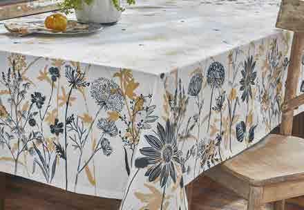 A G16027 GRATEFUL GATHERINGS TABLECLOTH (Multi) Cotton. Hand screen printed. Machine wash cold separately, tumble dry low. Folded, sleeve w/ header card. 84”L x 60”W. Pk 2 pcs. $27.50 ea.