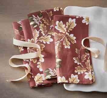 E NEW! G17390 OAK LEAF & ACORN NAPKIN S/4 (Brown Multi) Cotton. Hand screen printed, mitered corners, enzyme washed. Machine wash cold separately, line dry. Folded, tied w/ twill tape, hang tag. 20”L x 20”W.Pk 4 /set. $14.50/set.