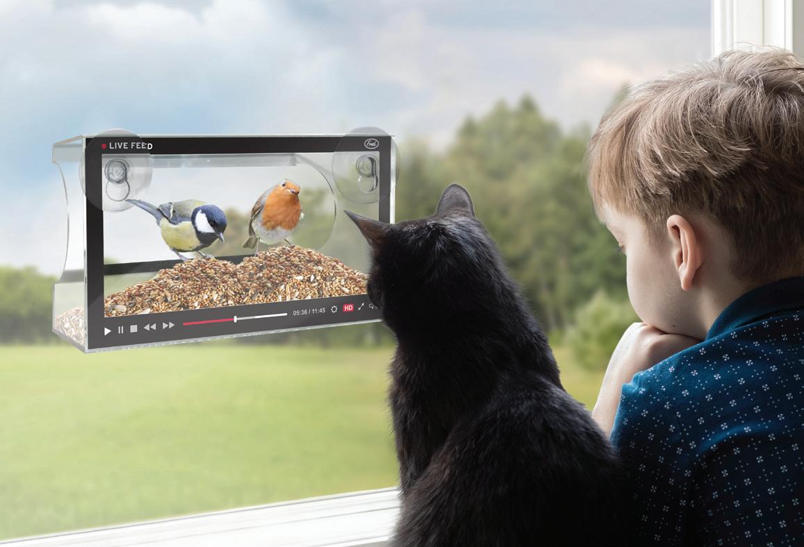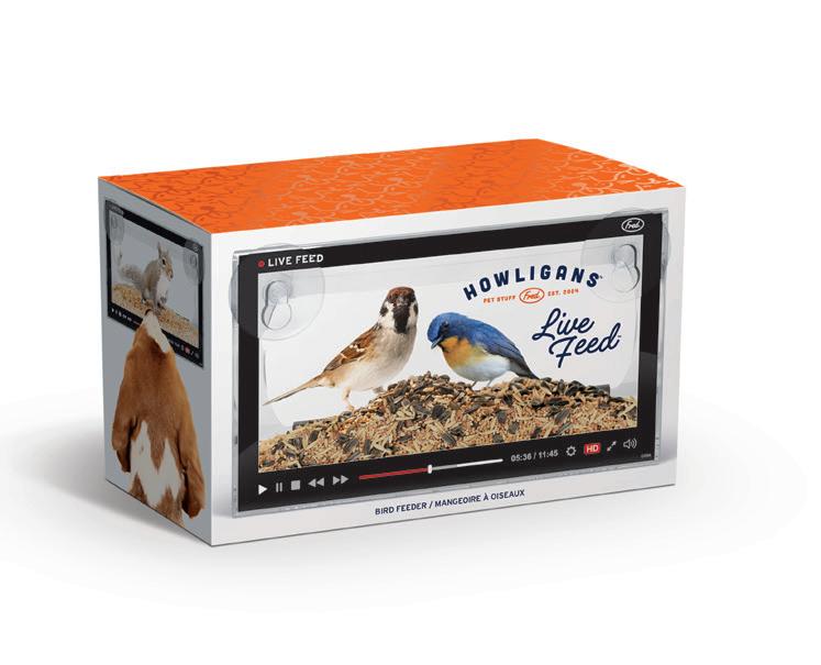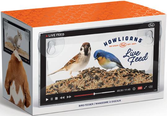Bird watching is about to go viral Howligans Live Feed is a cleverly designed bird feeder that provides endless entertainment for you and your pets. The quality acrylic feeder measures 8.5" x 3.5" x 5" and sticks to your window for a strong, secure hold. Includes 2 suction cups and is packed in a giftable color box. Design by Steve Buss.