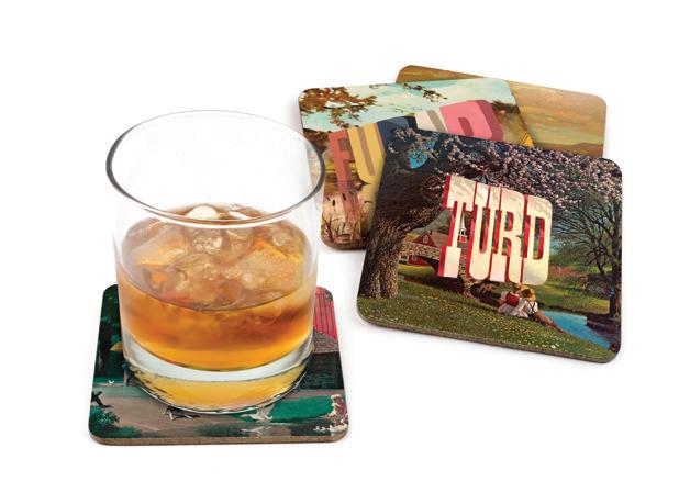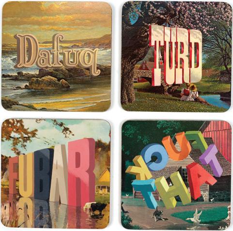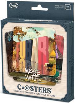 Water rings on the coffee table? F*ck that! Pour yourself another and protect those tabletops with C*@$ters, a playfully profane coaster set featuring art by Wayne White. Includes 4 coasters made of durable MDF with cork backing and features original artwork including: Fuck That, Turd, FUBAR, and Dafuq. Packed in a full-color, peggable SBS box. Design by Wayne White.