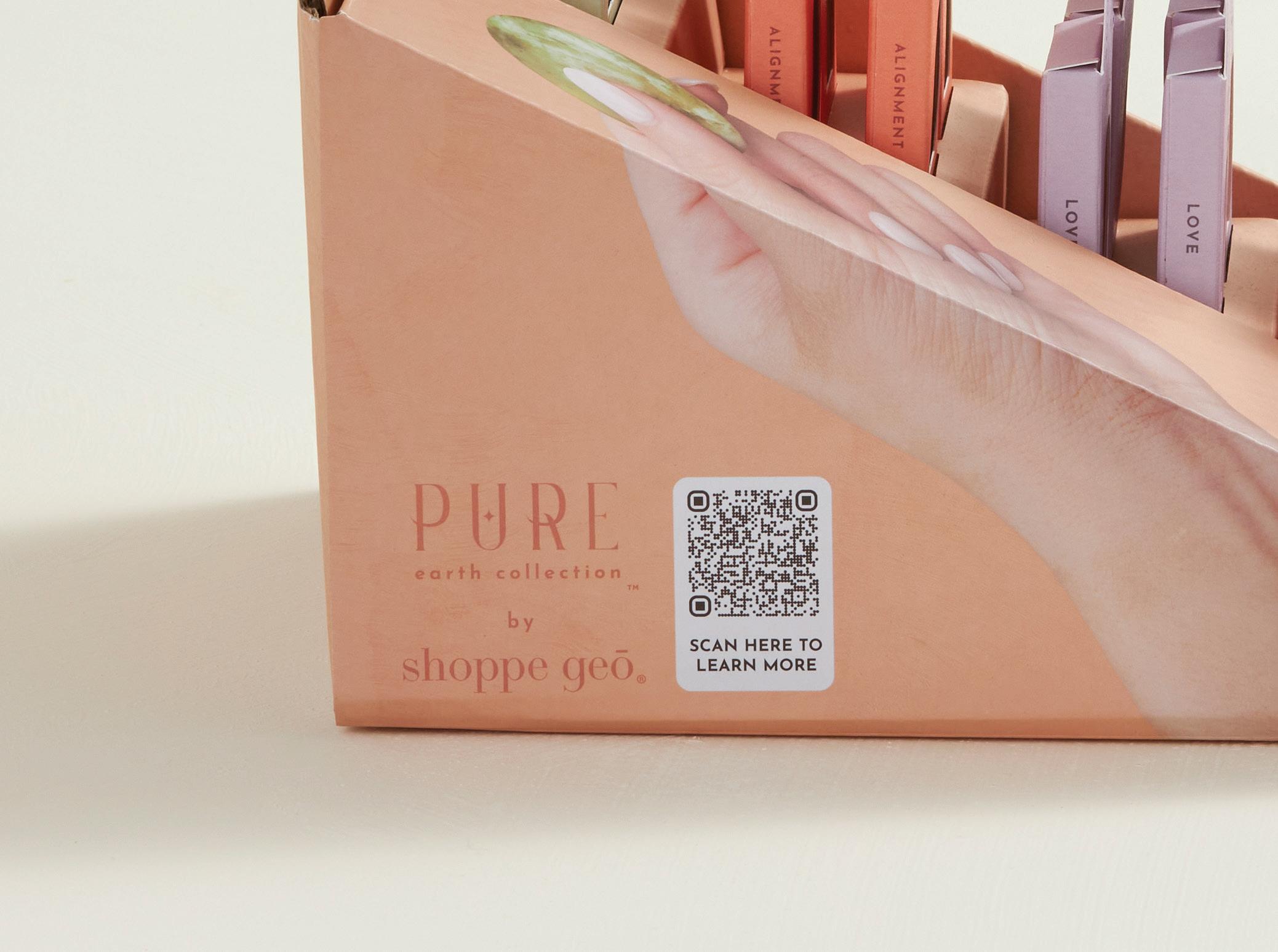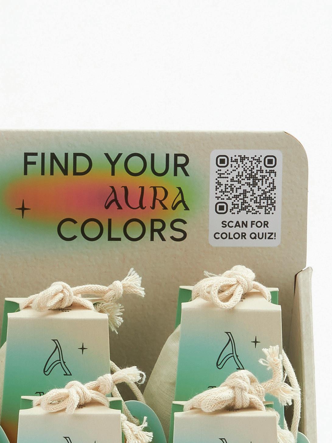 Aura Color Quiz QR code featured on display and product packaging –interactive in-store and at home packaging includes crystal properties and benefits of
