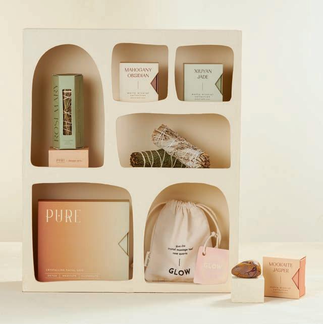 PURE Earth Collection is a capsule collection by Shoppe Geo. It is an offering of beauty and wellness products from the earth, with colors reminiscent of those found in serene landscapes. Inspiration gathered from ancient wellness tools is reimagined and modernized for current self-nourishment practices. Products include a crystalline facial grid, two styles of gua sha tools, three types of natural palm stones, and three varieties of dried herb bundles. Holistic design principles, such as sustainable sourcing and regenerative product life cycles, are present throughout the collection. Mindful design details allow for retailers to easily merchandise products as a full collection or feature individual items in a curated environment.