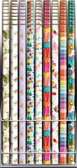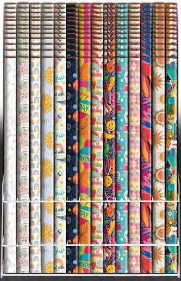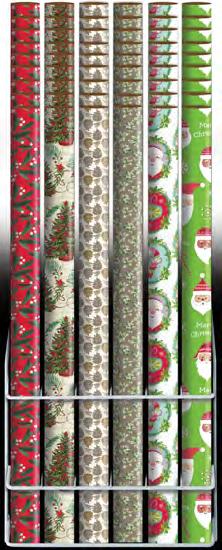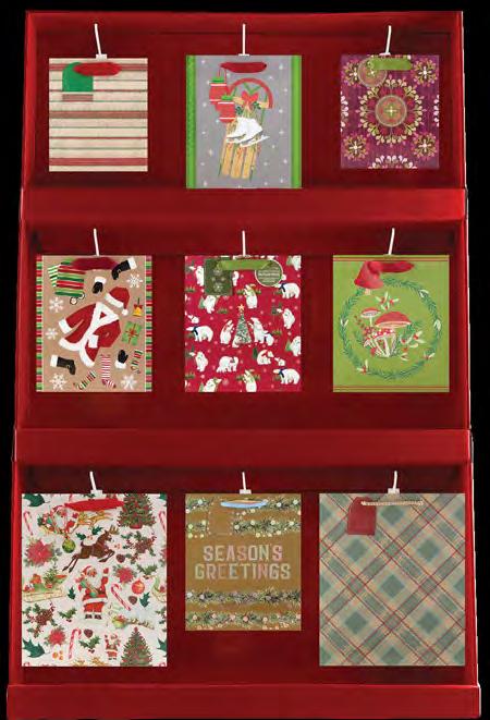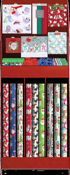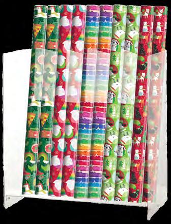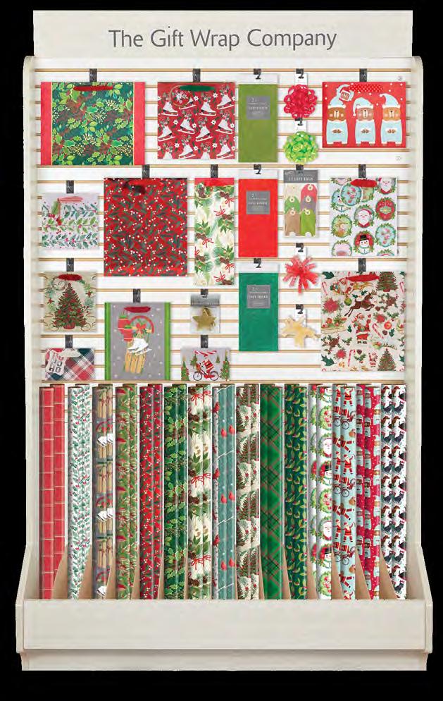 We suggest 1 facing of large gift bags, 1 facing of medium gift bags, 1 facing of small gift bags, 2 facings of mini gift bags, 1 facing of gift tissue, 1 facing of gift tags, 1 large bow, 1 medium bow and 3 styles of ribbon. Displayer holds 108 jumbo rolls of gift wrap, 9 facings at 12 rolls deep.