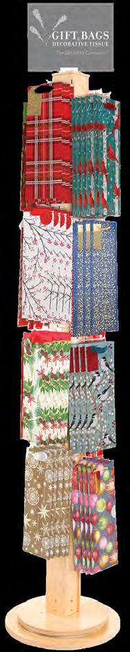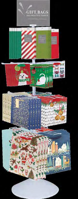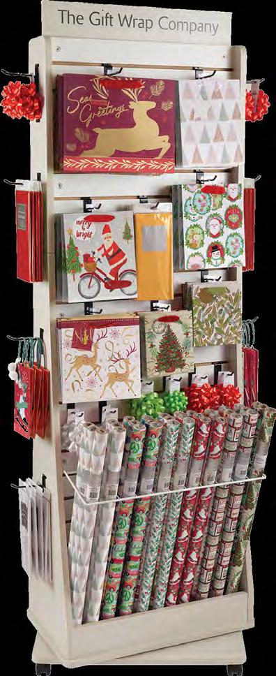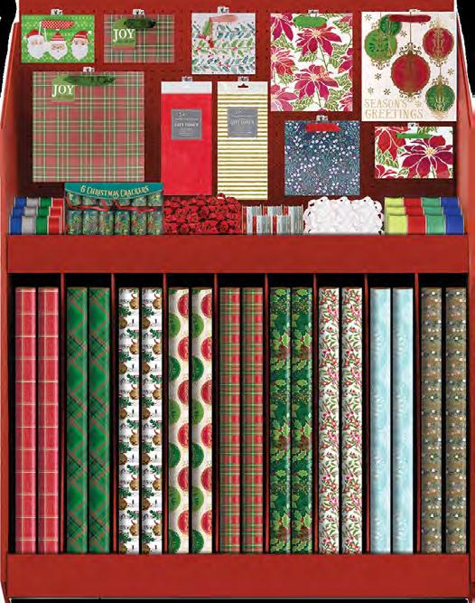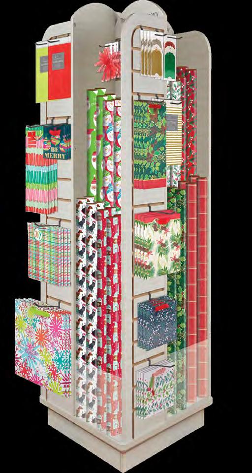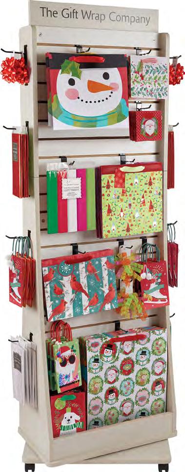 We suggest 2 facings of large gift bags, 2 facings of medium gift bags, 2 facings of small gift bags, 2 facings of mini gift bags, 2 facings of gift tissue, 2 facings of gift tags, 4 large bows, 4 medium bows and 6 styles of ribbon. Displayer holds 216 jumbo rolls of gift wrap, 18 facings at 12 deep.