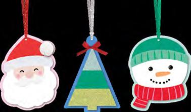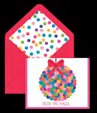 9.75 in x 9.75 in x 4 in $18.00 pack of 6 | $3.00 each printed on white kraft, embossed, pom pom handle