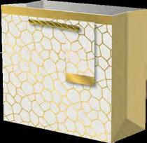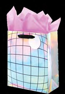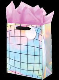 10.5 in x 12.5 in x 5 in $19.50 pack of 6 | $3.25 each holographic foil, printed on white kraft, grosgrain ribbon handles