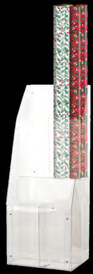 Freestanding, clear acrylic unit, holds 90 consumer size rolls or 60 jumbo size rolls of gift wrap; gift wrap sold separately. Assembly required.