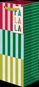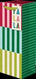 4.875 in x 13.625 in x 4.875 in $18.00 pack of 6 | $3.00 each printed on white kraft, grosgrain ribbon handle