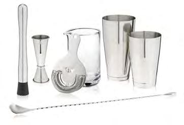 I ncludes Boston shaker tin & glass with measurements, muddler, bar spoon, strainer, double jigger, & pourer