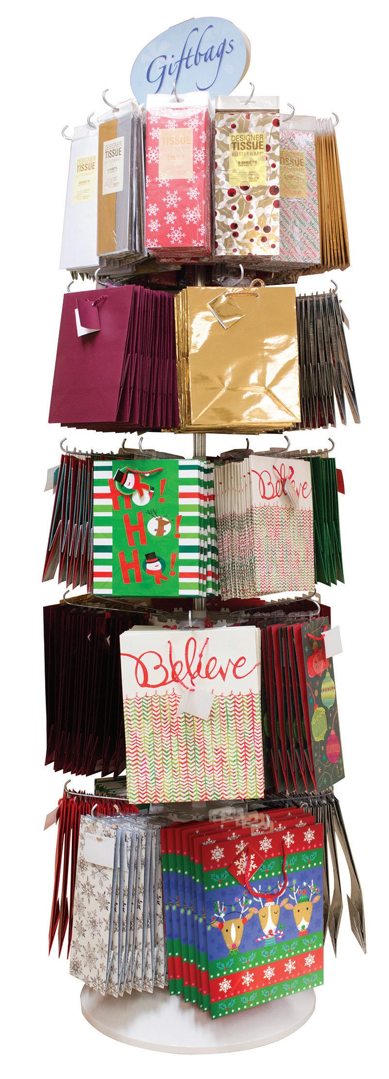 holds 12 tissue paper desiGns, 12 medium baG desiGns, 4 larGe baG desiGns, 8 bottle baG desiGns