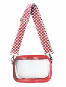 This go anywhere bag made of clear pvc is ready for your adventure from game day to concerts! Meets all stadium regulations. Adjustable 1.5” width crossbody strap included. Spot clean.