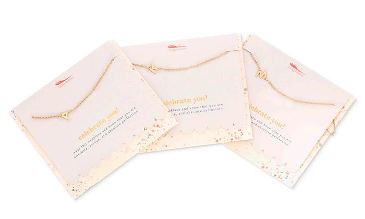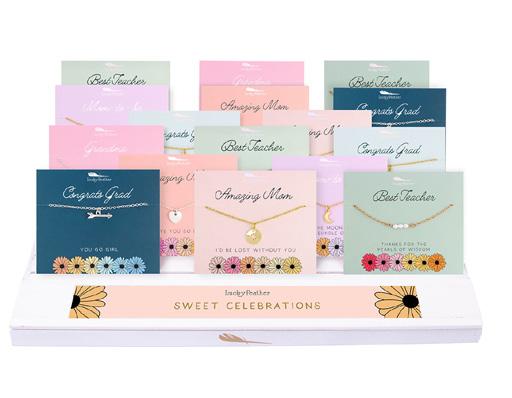 Be the go-to store in the neighborhood that always has the perfect gift for any occasion! Meet Lucky Feather, a womanowned, Los Angeles based company whose mission is to create beautiful, on-trend jewelry, that spreads positivity and good vibes for an incredible value. Any occasion, any day, your customers will be so thrilled to walk into your store and spot a Lucky Feather display filled with meaningful, perfectly packaged gifts for all of their peeps. You’ve got your customers and Lucky Feather’s got you!
