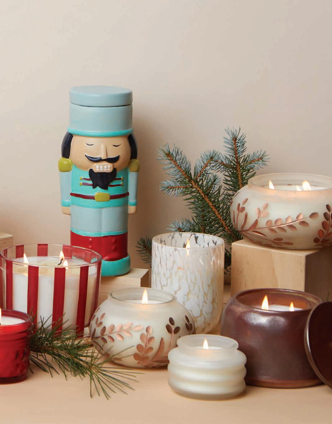 G. NOEL ETCHED GLASS CANDLE - CRANBERRY ROSÉ (4) H. NUTCRACKER CANDLE - BALSAM & FIR (4)