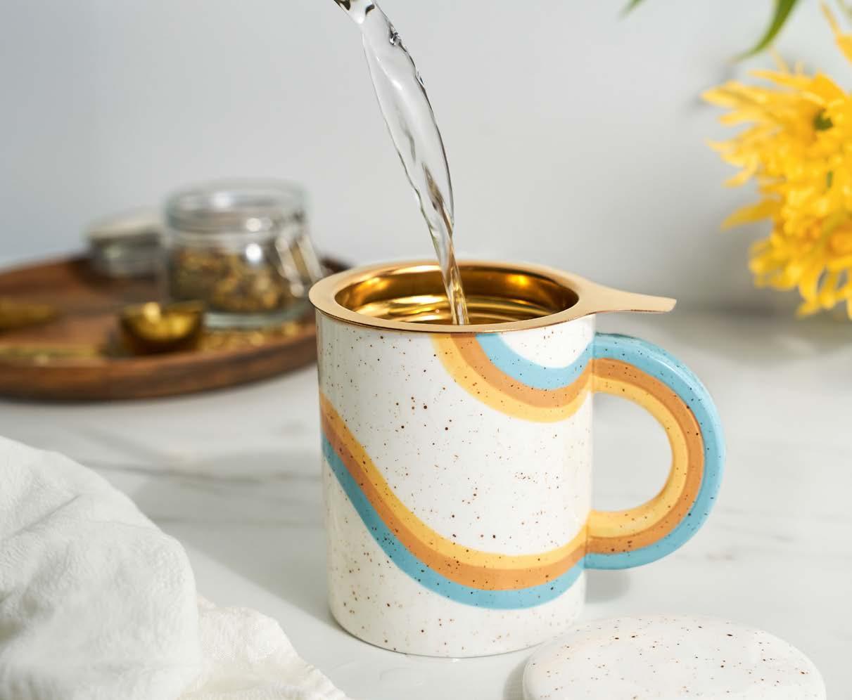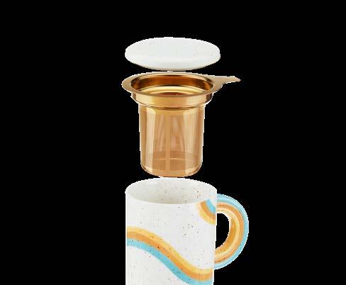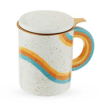 Upgrade your morning routine with a cute loose leaf infuser mug. The stylish white speckled ceramic has colorful rainbow details paired with a bright gold infuser—perfect for your morning chai latte or evening cup of tea.